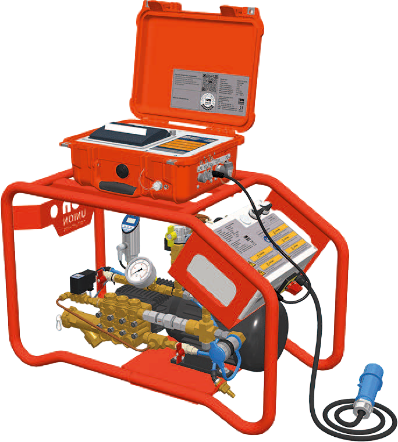 Dieses besteht unter anderem aus einem Druckprüfkoffer PMS3000 zur Durchführung der Dichtheitsprüfungen mit einem integrierten, bedienerfreundlich und grafikfähigem 7“ bzw. 4,3“ Farb-Touchdisplay und den Prüfpumpen EPP für den Druckaufbau bei Dichtheitsprüfungen von Trinkwasserleitungen.